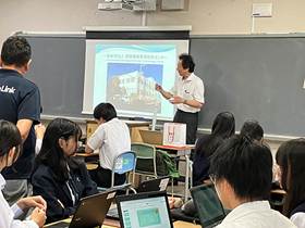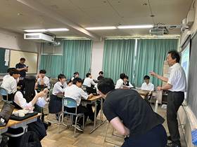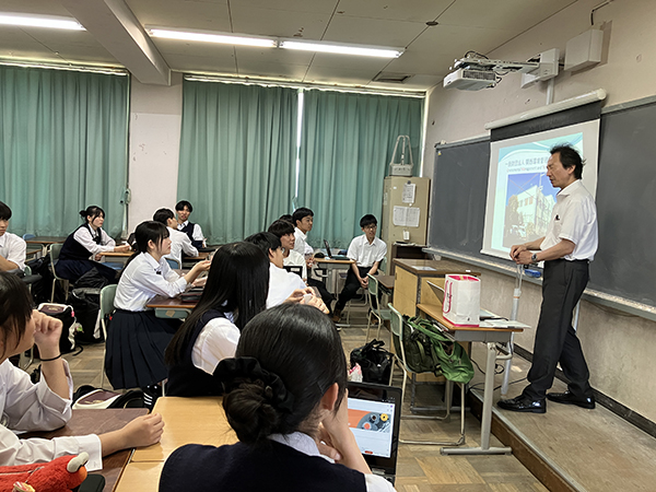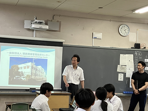 このプログラムの一環として、令和7年6月19日に教室で実施された企業講演会及び意見交流会では、当センター測定分析部長の柴谷尚男と測定分析課長の竹内有香が参加し、理数系の生徒様19名(6グループ)を対象として当センターの業務内容と環境に係る測定分析の重要性について解説するとともに、生徒自身がグループごとに設定した種々の課題に対する問題等について意見交流を行いました。